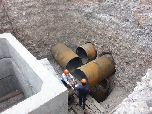 此段管线单趟35米,给回水两趟共70米,顶管施工部位地处老居民区旁,施工区域狭窄,土层为巨厚卵石层,土质坚硬,密实度高,给顶管施工造成较大难度。热网扩建项目部针对现场实际情况,采取人工掏土,液压顶管的方法施工,在充分做好准备工作的前提下,施工人员严格按照施工技术方案进行科学施工,如期的完成顶管任务,确保了节点工期,从而为整个热网的贯通打下的基础。