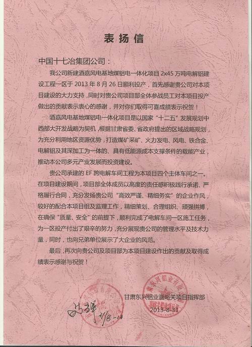 8月31日,酒钢集团东兴铝业嘉峪关项目指挥部向甘肃分公司酒钢电解铝项目部送来表扬信,对我公司项目部全体参战员工对该项目一区投产做出的贡献表示衷心的感谢。酒嘉风电基地煤铝电一体化项目2×45万吨电解铝建设工程一区已于8月26日投产。