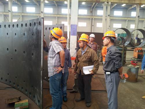 印尼业主代表及中冶京诚代表一行在高炉炉壳制作现场听取了项目的整体规划和制作进展情况汇报,对项目的工程、质量和现场环境等方面进行深入交流与沟通。高炉炉壳1-4带、热风炉1-10带、热风炉靴粱等构件通过验收‚一次性合格率为100%‚受到了中冶京诚及驻京外方代表的高度评价和充分肯定。