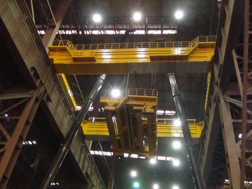 10月24日上午,十七冶马钢四钢轧工程一台设备总重232吨,起重量160t的铸造桥式起重机,在伸着巨臂的240吨大吊车的提升下缓缓转身,徐徐升空,分别将两个自重50吨的巨型行车主箱梁准确就位在高