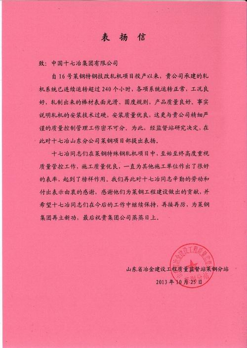 日前,山东省冶金建设工程质量监督站莱钢分站致信中国十七冶集团,表扬山东分公司莱钢项目部精细严谨的质量管控工作和山东分公司优质高效地为莱钢工程建设做出的贡献,并对此表示衷心的感谢。