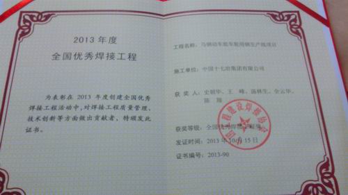 日前,由中国十七冶承建的马钢动车组车轮用钢生产线工程,荣获2013年度全国优秀焊接工程,受到中国工程建设焊接协会的隆重表彰。 马钢动车组车轮用钢生产线工程自2010年9月28日开工以来,十七冶集团建设者们以聪明的智慧、精湛的技艺和辛勤的汗水,经过13个月的拼搏奋战,高效、优质地建起了一条包括炼钢、连铸和轧钢在内的新型全流程现代化的钢铁联合生产线,向马钢奉献了一个精品工程,交上了一份满意答卷,整个生产工艺流程具有当今世界一流水平。其工期之短,建设速度之快,工程质量之优,被业主誉为创出了“马钢工程建设的新速度”,攀上了马钢工程建设水平的新阶梯,开创了十七冶工程建设的新品牌。