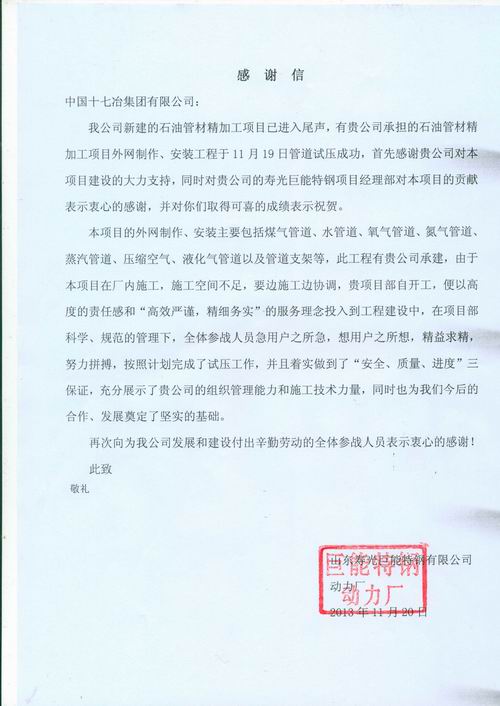 日前,山东寿光巨能特钢有限公司向我公司发来感谢函,对中国十七冶集团为山东寿光巨能特钢有限公司的发展所做的辛勤付出表示衷心的感谢。