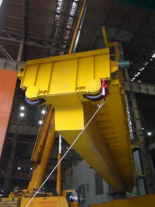 11月22日,十七冶马钢四钢轧工程一台起重量90t的铸造桥式起重机,两个自重分别为40吨和45吨的巨型大梁,在大吊车的提升下徐徐升空,分别将两个巨型行车主箱梁准确就位在高