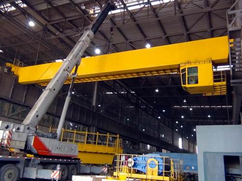 12月25日上午,十七冶马钢四钢轧工程一台起重量80t的铸造桥式起重机,两个自重分别为35吨和29吨的巨型大梁,在100吨汽车吊的提升下徐徐升空,分别将两个巨型行车主箱梁准确就位在高