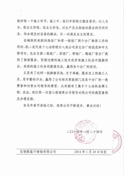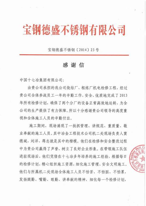 日前,宝钢德盛不锈钢有限公司向我公司发来感谢信,,对我公司承建的烧结厂、粗炼厂机电检修工程中全体参战员工的辛勤工作及辛勤付出和我公司领导的高度重视表示感谢。