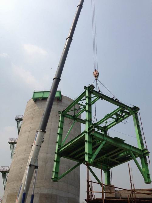 该仓顶钢结构转运站位于仓顶平台上部,转运站外形尺寸为16m*7.5m*9.325m,底部标高+36.5m,共分为两层,第一层为K112胶带机机头设备安装平台,标高+39.97m,第二层屋面结构标高+45.825m,现场组装成框架结构,单吊起吊重量约33t。为保证大件吊装工期,争取超高空作业在青奥会前顺利完成,在公司领导的关怀和支持下,项目部和机装一处根据既定节点计划,争分夺秒顺利完成仓顶转运站组装工作,这是继筒仓仓顶平台顺利吊装后的又一个重要节点,为后续K112通廊全线贯通以及短流程电缆敷设打下了坚实的基础。