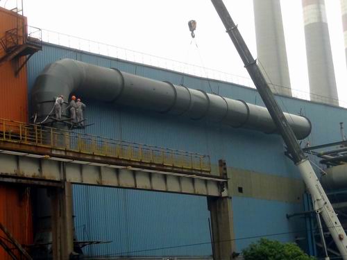 电除尘项目是马钢新区后期结构调整四钢轧配套工程炼钢连铸工程的重点环保系统项目,该系统包括除尘烟囱、除尘管道、电气室、电除尘本体、风机、冷却水管等。这次吊装的除尘管道是电除尘系统的主体结构之一,是火焰清理区域排泄粉尘的主要管道,总长度70余米,直径