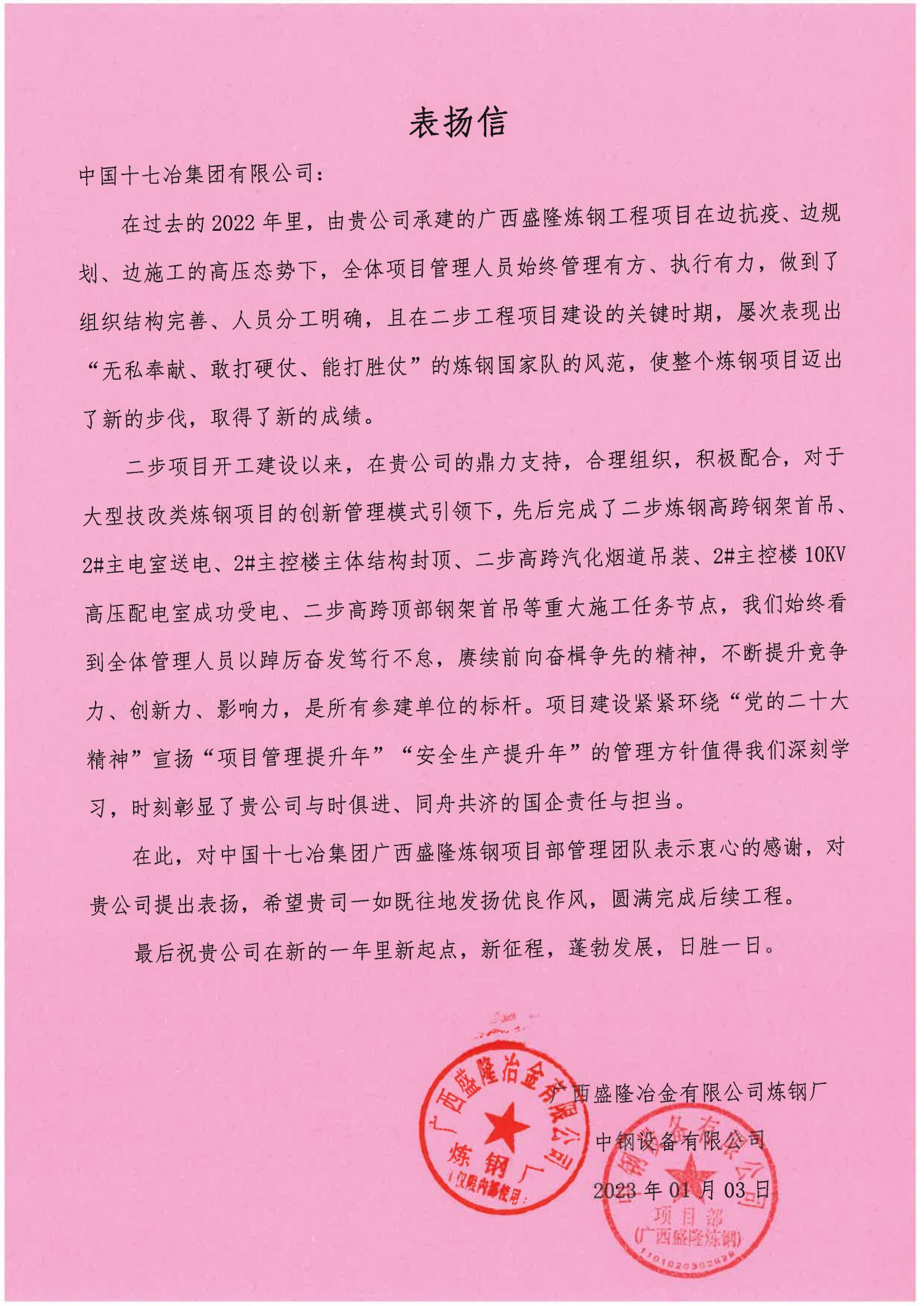 1月3日,中国十七冶集团收到广西盛隆冶金有限公司及中钢设备有限公司致来的表扬信,对冶金工程技术分公司广西盛隆炼钢工程项目部在2022年里,为项目建设迈出新的步伐,取得的新成绩给予了高度赞扬和充分肯定。