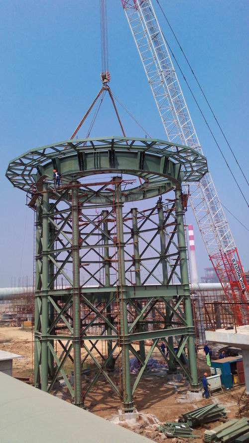 此次圈梁吊装是先将内外两组圈梁、连接辐梁、以及圈梁外平台在地面组对焊接完成后整体吊装。组装好的圈梁直径19米,重45吨,利用施工现场已有260吨履带吊直接整体吊装就位,打破了过去构件分件吊装的低效率传统模式。为了保证此次吊装的顺利进行,冶金公司参建人员进行了精确的计算和反复的论证,充分合理的利用现场已有条件,在保证安装质量的前提下,降低了成本投入,避免了交叉作业,减少了高空作业,大大提高了安全系数,加快了安装进程,吊装作业得到了业主和监理单位的一致好评。