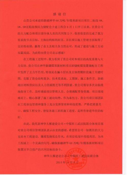 神华大雁建设公司·中煤科工武汉院联合体在发来热情洋溢感谢信的同时,希望我公司一如既往的大力支持该工程建设,继续发扬优良作风,在项目收尾阶段再接再厉,为该工程画上一个美满的句号。