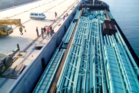 湛江市距离马鞍山约为1850公里,需跨越4个省,而本次加工构件单件最长为29.98米,单件最重的有35吨,因此通过陆路运输的方案根本行不通,装备制造公司钢构厂经过多次研究多方咨询,最终选择海运运输。而海运运输的特点是单次运输量特别大,单次少则1000吨以上。不过船舱内一次性码放大量形状规格不一的钢结构,空间浪费很大,而且成品保护的难度相当大,如果不能合理规划,运输费用将非常高昂。既要保证船运钢结构完好按时到达目的地,又要使得运输成本可控,钢构厂经过精心调研策划、合理组织调度,最终前后分三船将首批钢结构安全运抵湛江施工现场,并成功将运输费用控制在合理区间内。