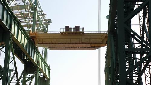 520吨铸造起重机是宝钢湛江炼钢区钢水接收跨关键设备,是目前世界同类产品中起重量最大,轮压最低的冶金铸造起重机。其主要用途是在高温、多粉尘的恶劣环境下,完成1600多摄氏度钢水的吊运工作,其工作繁忙程度为起重机最高级别。该设备采用了 “四梁六轨、低速轴连接大减速器结构形式”,集多种先进技术于一身。为了保证工作中的安全可靠,520吨铸造起重机采用了4根钢丝绳悬挂系统,当其中任意一根发生断裂,能保证钢水包不发生坠落和倾斜,并对钢水包实时视频监控,避免了操作人员的视觉盲区。它还配备了最先进电气变频调速系统,设有制动回馈装置和故障自动诊断系统,能够对起重机进行实时监测,及时发现运行异常,记录运行数据。与同类设备相比,它具有结构布置受力合理,安全可靠、运行平稳、节约能源等优点,整体技术水平达到国际领先水平。