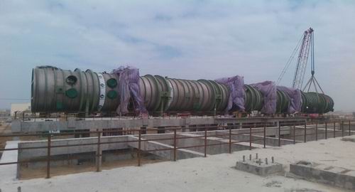 2月3日下午,随着宝钢湛江海水淡化项目最后1效蒸发器平稳吊装就位,由中国十七冶集团承建的 2×15000吨/天热法海水淡化工程II标段1#蒸发器的七效蒸发器提前7天全部吊装完成。 该蒸发器总长78.4米,743吨,共分7效6段,每段蒸发器下仅有一个支座,每段蒸发器的吊装只有在筒体找正好并焊接固定后,吊车才能摘钩。冶金公司积极落实“24小时工作法”,以“一天也不耽误、一天也不懈怠”工作作风,不惧艰难,努力拼搏,积极主动与设计、业主、监理等相关单位沟通联系,并通过各种渠道收集相关资料,解决了蒸发器双相不锈钢的焊接技术难题,克服了蒸发器体积大、吨位重的吊装难度,顺利完成1#蒸发器的全部吊装工作。