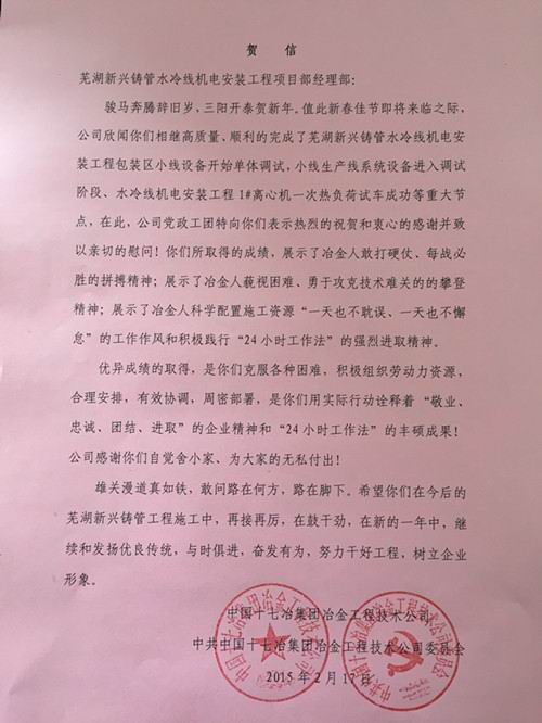 日前,公司获悉芜湖新兴铸管水冷线机电安装工程项目经理部顺利完成了芜湖新兴铸管水冷线机电安装工程包装区小线设备开始单体调试,小线生产线系统设备进入调试阶段、水冷线机电安装工程1#离心机一次热负荷试车成功等重大节点,及时发出贺信予以表彰。公司希望各分公司、项目经理部、工程处(厂)、机关各部室全体员工学习他们藐视困难、勇于攻克技术难关的攀登精神,诚信履约、勇创佳绩,科学配置施工资源,“一天也不耽误、一天也不懈怠”的进取精神,为十七冶集团“项目效益提升年”添彩。