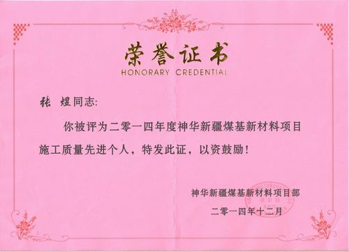 3月15日,由中国十七冶集团冶金工程技术公司承建的神华新疆68万吨/年煤基新材料卸储配煤工程施工质量管理获业主肯定,中国十七冶集团新疆神华卸储配煤工程项目部张煜同志被评为2014年度新疆神华卸储配煤基新材料项目施工质量管理先进个人。