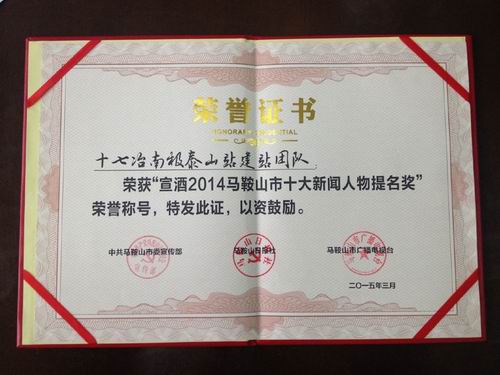 3月17日上午,在2014马鞍山年度新闻人物评选颁奖盛典上,公司南极泰山站建站团队获得年度新闻人物提名奖表彰。