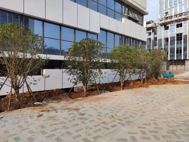 三月份以来,施工现场迅速步入大干狂潮,项目部严守工期,秉承一天也不耽误,一天也不懈怠的中冶精神,推进项目进度,确保工程质量。沥青路面在雨天有着良好的排水及防滑作用,对城市内涝具有一定缓释作用。本次沥青铺设所用到的原材料及加工经项目部严格把控,确保铺设质量。绿化工程目前已完成核心广场、篮球场以及部分道路旁的约350颗绿树移栽,营养液悬挂,部分道路旁的绿树正在移栽中;现场草坪铺设正在准备阶段。绿化工程是为人们供给一个良好的休息、文化娱乐、亲近大自然的场合,是延续生态环境、改良城市生态环境的主要方法。