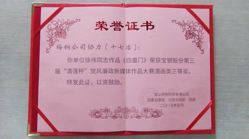 2014年9月,十七冶梅钢项目部积极响应国家党风廉政建设,参加了由宝山钢铁股份有限公司组织举办的第三届“清莲杯”党风廉政新媒体作品大赛,梅钢项目部准备了两部作品参赛,其中《四重“门”》以工程为载体,通过新颖的立意在众多作品中脱颖而出,获得漫画类三等奖。通过参加比赛,进一步展示了企业员工在文化活动方面的才能,激发了员工对自身素质全面发展的热情,对进一步加强员工素质培养,发展“一技多能”人才具有重要意义。