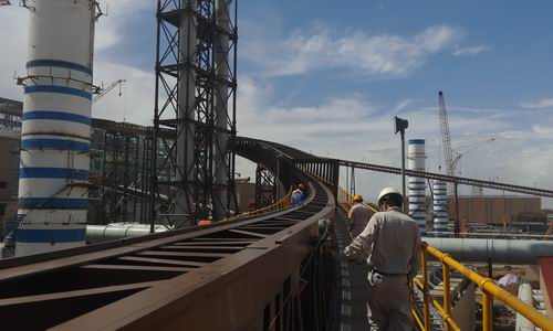 炼钢工程副原料上料系统皮带机共计五条,由两条通廊管式皮带机和三条普通皮带机组成,总长度为1688m,其中最长皮带机为D105通廊“S”型管式皮带机,长度为850m,调试难度巨大。由于该系统皮带机联调战线长,为确保皮带机联调工作的顺利进行,项目部精心策划组织,各施工处积极配合响应,积极践行“24小时工作法”,为湛江钢铁的如期投产贡献应有的力量。