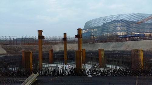 银川鸿曦悦海湾五星铂金酒店建筑设计高度219.30米,其中地上43层、地下2层。该酒店主体结构为钢结构框架支撑体系,钢结构工程量约13500吨,其中地下部分工程量约为1000吨,第一节钢柱由-14.750m筏板平面至-10.250m。项目部在钢结构吊装前认真组织、精心谋划,克服了图纸到场晚、准备周期短、场地狭小等不利因素,认真分析了吊装施工工艺及各项技术参数,对主体结构进行了控制测量定位,将每道工序落实到责任人,为工程的顺利吊装奠定了坚实的基础,仅用了一天时间就完成了首个节点全部钢柱的安装。
