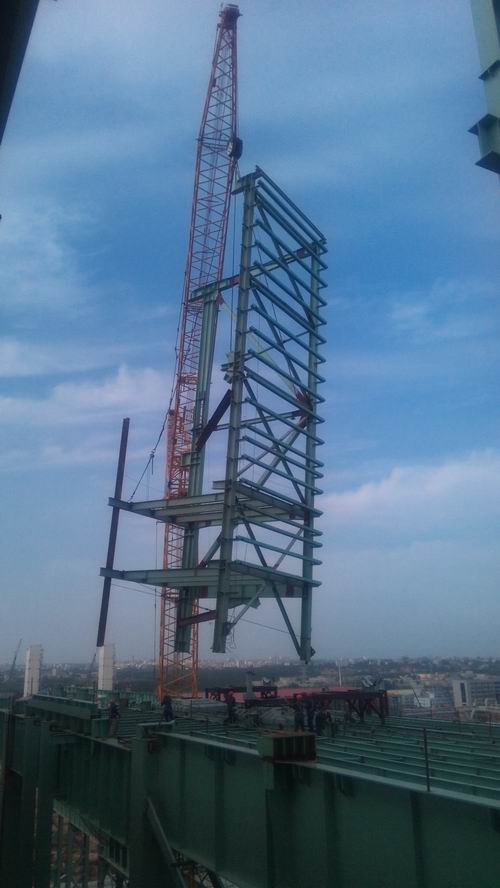 炼钢厂房屋面结构每跨由3个框架组成,每个框架的几何尺寸约为28m×9m。框架内有许多檩条、拉筋。如果按照过去的安装方法,先完成一根根小梁的框架组对,然后再安装框架中的檩条、拉筋,费时费力,而且高空作业的风险也很大。在屋面施工中,机装二处采用将屋面框架内的檩条、拉筋全部在地面组装的方法,一吊上去一组屋面框架结构就安装就位,分组吊装大大提高了工时工效,减少了高空作业的不安全因素。无独有偶,在46m以上的高跨厂房安装中,他们也是结合现场实际,吊装前在地面完成框架组对,把框架内各层工艺平台、柱间支撑、封墙系统等全部安装就位,打磨、油漆等工序全部在地面完成,组装后的框架结构形成一个独立的组合体,仅用很短的时间就完成了高跨厂房钢结构的安装任务。同样的事例还反映在墙皮的安装中,封墙系统抗风柱高约25m,每根抗风柱之间还有许多檩条、拉筋。以往都是一根根抗风柱先就位后再去安装檩条、拉筋等,高空作业多、效率低下。机装二处在墙皮安装中,将抗风柱在地面组对成框架并完成框架内所有结构件的安装后整体就位,安全、高效、快速地完成了墙皮的安装任务。在氧枪系统各层工艺平台的安装中,这种因地制宜,灵活运用组合吊装的方法也得到了充分的运用。