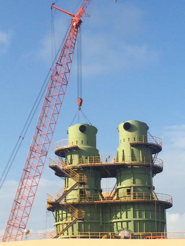 本系统为1#600TPD 双膛竖窑焙烧系统,其结构设计高度▽52.5m,其中窑本体窑壳设计高度▽35.72m。此窑壳最后一段的吊装受到了业主、监理高度关注。面对工期紧、图纸复杂、气候多变以及安全危险系数高等不利因素,我施工处充分发扬“高效严谨、精细务实”的企业作风,以“一天也不耽误、一天也不懈怠”的工作态度,积极践行“24小时工作法”,优化吊装方案,合理组织劳动力,积极与设计、业主及监理沟通联系,最终顺利完成窑壳的安装任务,完成节点要求,为后续工序奠定了坚实的基础,为实现“湛江蓝、中冶梦”而拼搏。