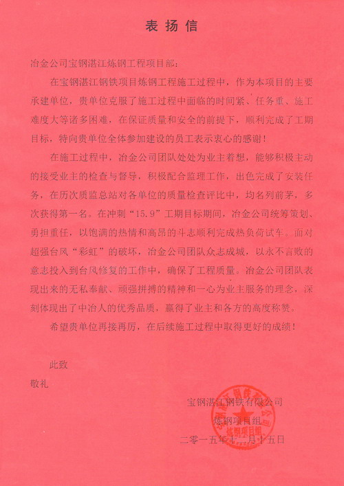 对此,宝钢湛江钢铁炼钢项目组发来表扬信,对冶金公司全体施工人员在工程建设中的突出表现做出了充分的肯定。