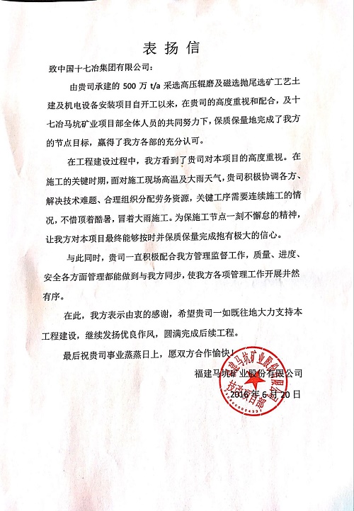 6月20日,福建马坑矿业股份有限公司向我公司发来表扬信,表扬我公司在500万t/a采选高压辊磨及磁选抛尾选矿工艺土建及机电设备安装项目面对各种不利因素,力保工程施工节点不耽误,一刻也不放松、不懈怠的出色表现。