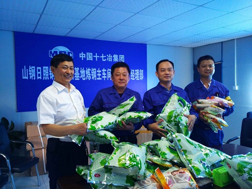 为做好夏季防暑降温和安全生产工作,切实保障现场施工的顺利进行,7月16日,中国十七冶集团冶金工程技术公司山钢日照炼钢主车间项目开展“送清凉”活动,公司纪委副书记张云彩、安全监管部部长张玉华为正值高温施工的山钢日照炼钢主车间项目一线人员送去关怀。