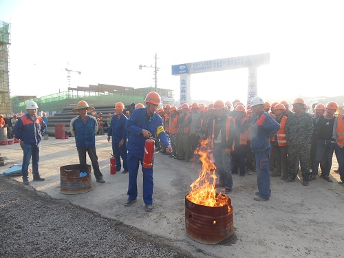 本次演习组织演练了施工现场中最为常见的三种失火现象,包括油漆失火、施工木材失火以及塑料泡沫失火,并根据不同的失火原因,现场演练了相应的灭火措施。同时,为了进一步加强项目施工人员的安全意识,提高施工人员对突发失火情况的应变能力和灭火施救能力,项目部安排多位施工人员直接参与了灭火演练。