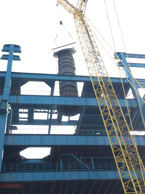 1#转炉汽化烟道是炼钢转炉本体系统的关键设备,共6段,分6段进场。其中斜直段是设备安装的基准段,斜直段总长为21m,直径为3.85m,重62.44t,采用300吨履带吊进行吊装,炼钢塔楼设备多,重量大,安装过程中必须要合理结合钢结构进行设备的穿插施工,工序衔接紧密,施工空间狭小、难度大、工期紧、任务重。为了满足后续工程施工条件,保证工期,项目部组织参建工程处在吊装前多次对吊装场地测量检查,精心组织,合理安排,积极践行“高效严紧,精细务实”的企业作风,克服施工场地小、设备运输摆放困难、安装精度高等困难,以“一天也不耽误,一天也不懈怠”的进取精神,积极践行24小时工作法,确保了汽化烟道斜直段顺利吊装,为后续的各专业施工创造了有利条件,同时也得到了业主的高度赞扬和肯定。