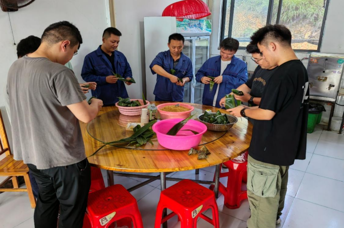 下午大家欢聚项目部食堂,一起开始包粽子。职工们按捺不住内心的热情,跃跃欲试,有熟悉的、有生疏的、有现学的,现场很是热闹。会包粽子的职工现场传授技巧,耐心指导,不会包粽子的职工虚心学习,认真上手实践,逐渐掌握了包粽子的窍门。大家愉快地分享着自己家乡端午节的习俗,在包粽子的过程中感受到了端午节蕴含的悠久文化历史与传统。