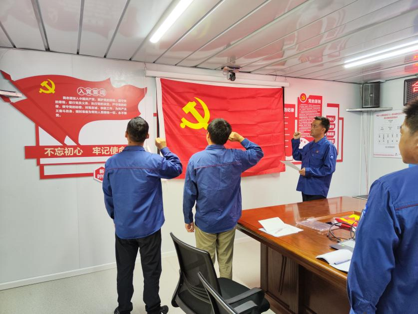 宣誓仪式在庄严雄壮的《国际歌》歌声中拉开了序幕,预备党员夏耀祖、苏静在党支部书记的带领下,高举右拳,面对党旗发出了铮铮誓言。宣读完毕后,老支部书记为他们发放党章,项目经理、支部书记分别为他们佩戴党徽。这种以老带新、薪火相传的仪式,是一种鞭策,也是一种激励;是一种精神的传承,也是一种奋斗的延续。在表态发言中,表达了立足工作岗位、踏实工作,谨守誓言,全心全意为人民服务和为党为民奉献的坚强决心。
