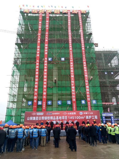12月26日,由中国十七冶集团冶金工程技术公司承建的全国同类行业体量最大的山钢日照钢铁精品基地高炉公辅工程矿槽主体结构顺利封顶,山钢日照分公司经理王子金,监理部部长禹化成,山东冶金设计院院长谷卓奇等出席了封顶仪式,中国十七冶集团副总经理伍昌国代表施工单位出席并致辞。