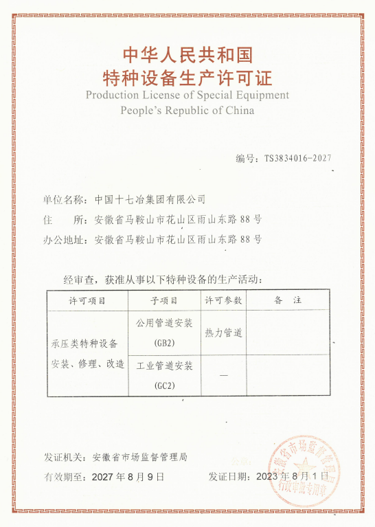 近日,中国十七冶集团有限公司顺利完成四年⼀次特种设备生产许可(压力管道安装)换证评审工作,收到由安徽省市场监督管理局核发的最新版《特种设备生产许可证》。