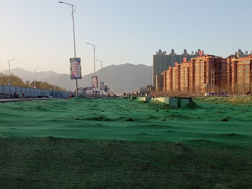 石嘴山市处于干旱半干旱地区,属典型的温带大陆性气候,空气干燥,蒸发强烈,管廊施工路段经过密集的居民区,开挖路段易引发尘土污染。项目部采取多种措施进行扬尘治理,全体成员行动对堆土场及管廊回填部分采用防尘网全覆盖,运土土方车辆采用篷布遮盖,施工道路及堆土场内洒水车定时洒水降尘,取得了明显的效果。