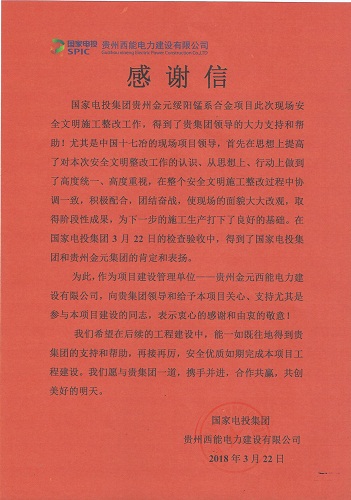3月27日,中国十七冶集团有限公司收到国家电投集团贵州西能电力建设有限公司发来的感谢信。