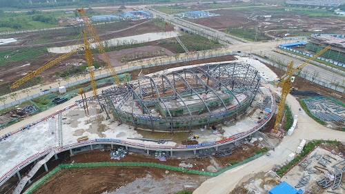 6月10日下午,由中国十七冶集团有限公司冶金工程技术分公司承建的滁州高教科创城文体活动中心工程游泳馆钢结构安装闭合,该单体工程主体结构全面封顶,这是继5月手球馆封顶之后又一场馆进入钢结构封顶。