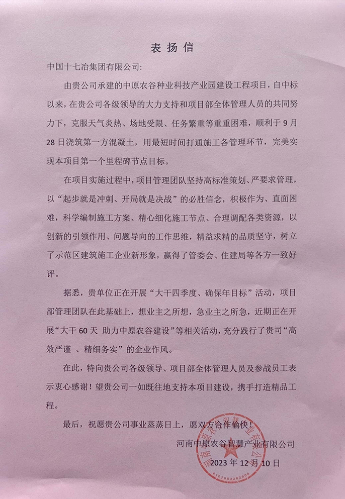 2023年12月10日,河南中原农谷智慧产业有限公司向中国十七冶集团中原农谷种业科技产业园建设工程项目经理部致表扬信,表扬我项目部在工程建设中坚持高标准策划、严格各项要求管理,以“起步就是冲刺、开局就是决战”的必胜信念,积极作为、以坚韧的品质坚守直面困难,树立了示范区建筑施工企业新形象,赢得了管委会、住建局等各方一致好评。