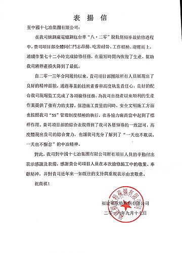 9月17日,福建福欣特殊钢有限公司向中国十七冶集团有限公司发来表扬信,对冶金工程技术分公司福欣特钢炼钢连铸厂、退酸厂长期维保工程项目管理团队在“八·二零”电炉钢包台车脱轨侧倾抢修过程中连续七十二小时抢修作业进行表扬。