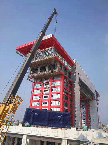 室外大型水冷螺杆机组设备为国门项目暖通工程的关键性设备,东西区各3组,共计6组,分别位于东西一区屋面,为国门楼主体建筑提供全部的空调系统循环用水。单台设备重达15吨,长度为14米,宽度为4米,设备吊装难度大,同时因现场场地限制,无法一次到位,本次吊装采用二次倒运吊装作业方式进行。