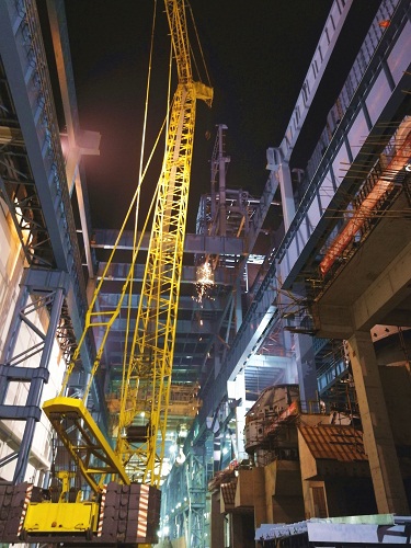 山钢日照炼钢二步工程项目为确保顺利实现3#转炉热试目标,塔楼钢结构安装采取效率较高的模块化施工、整体拼接方法进行吊装,实施24小时连续作业;转炉核心设备安装调整彻夜施工,为节点顺利实现提供有力保证,彰显了十七冶“冶金建设国家队”突出实力和顽强拼搏的奉献精神。