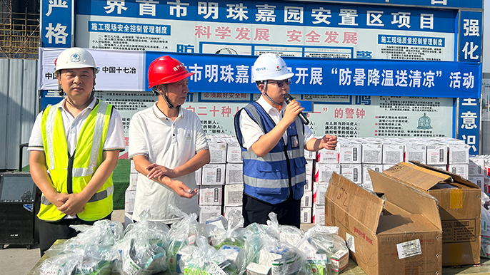 为持续推进“安全生产月”各类活动的开展,进一步落实《安全生产月活动方案》,切实做好连续高温天气下的防暑降温工作,保障一线工作工人的身体健康,6月13日,中国十七冶界首市明珠嘉园安置区项目组织开展了“防暑降温送清凉”活动。