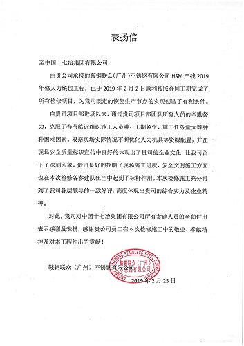 2月27日, 鞍钢联众(广州)不锈钢有限公司向中国十七冶集团发来表扬信,对中国十七冶集团有限公司冶金工程技术分公司鞍钢联众热轧HSM产线2019年修人力统包工程项目管理团队进行表扬。